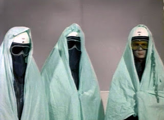 At any rate, we see a woman relaxing in a sauna that has a Venus de Milo statue next to the hot rocks. Her two companions leave, but she decides to stay a bit longer, with her eyes closed. And then the film expects us to believe that the three bikers easily waltzed in by using white towels as a "disguise."