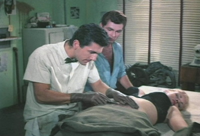 With Spike's help, Doc gets her on a table stripped down to her underwear and covered with a blanket. He "scrubs in" and then cuts her stomach open with his scalpel and the film briefly cuts in actual surgery footage of some gloved hands poking around in somebody's internal organs. Unfortunately, Friday wakes up, screams, and then dies. Doc shakes his head over another lost patient, but cheerfully tells Spike that at least his operating method is improving.