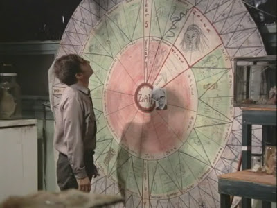 After burning more screentime by checking on the acidity of a ray's tank, he finally walks over to his big "wheel of diabolical plans" calendar and strokes the "self transformation" wedge. I guess that's the capper on the day's agenda, finally turning himself into a gill man after 20 years of planning.