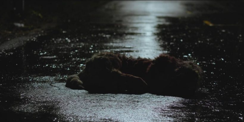 Since the bags are locked in the truck, she'll have to wait for Jesse to finish up before she can get them. In the meantime she follows the bloodstains on the road into the woods at the edge of the pavement. The wolf carcass is there and something has clearly been eating it. Unbeknownst to Lizzy, that something is standing right behind her, just out of focus.
