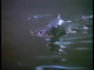 We sadly don't get too clear a look at the fish lizard, I'm guessing because it was a guy in a suit with severely limited mobility, but what we see is awesome. It's also rather hilarious, since it bites off the guy's leg and then runs off with it like a little scamp, so Ana is forced to watch him bleed to death.