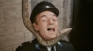 Of course, the trouble with the cure that Phillips created is that it didn't simply kill everyone in his lab and then stay put. Alas, hapless farmer Ian Bellows (Liam Gaffney) hears a strange sound in a cave while walking along his property one evening. Investigating the sound proves to be a bad idea, though the extent to just how bad an idea it is only becomes clear when his wife alerts Constable John Harris (Sam Kydd) of his disappearance. It doesn't take long for the Constable to find Bellows and he immediately fetches Dr. Reginald Landers (Eddie Byrne) to take a look at the corpse in the cave.
